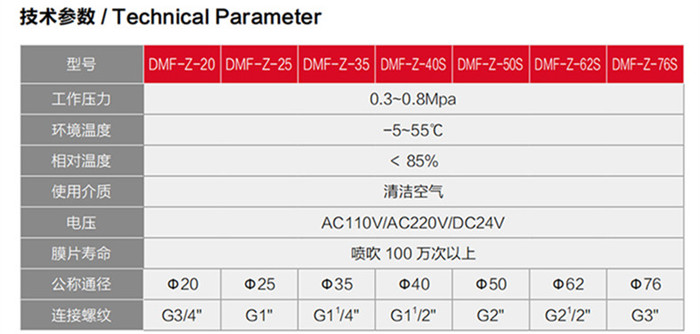 工作壓力:0.4~0.7, 環境溫度:-10~55(℃), 使用介質:清潔空氣, 膜片壽命:噴吹100萬次以上。